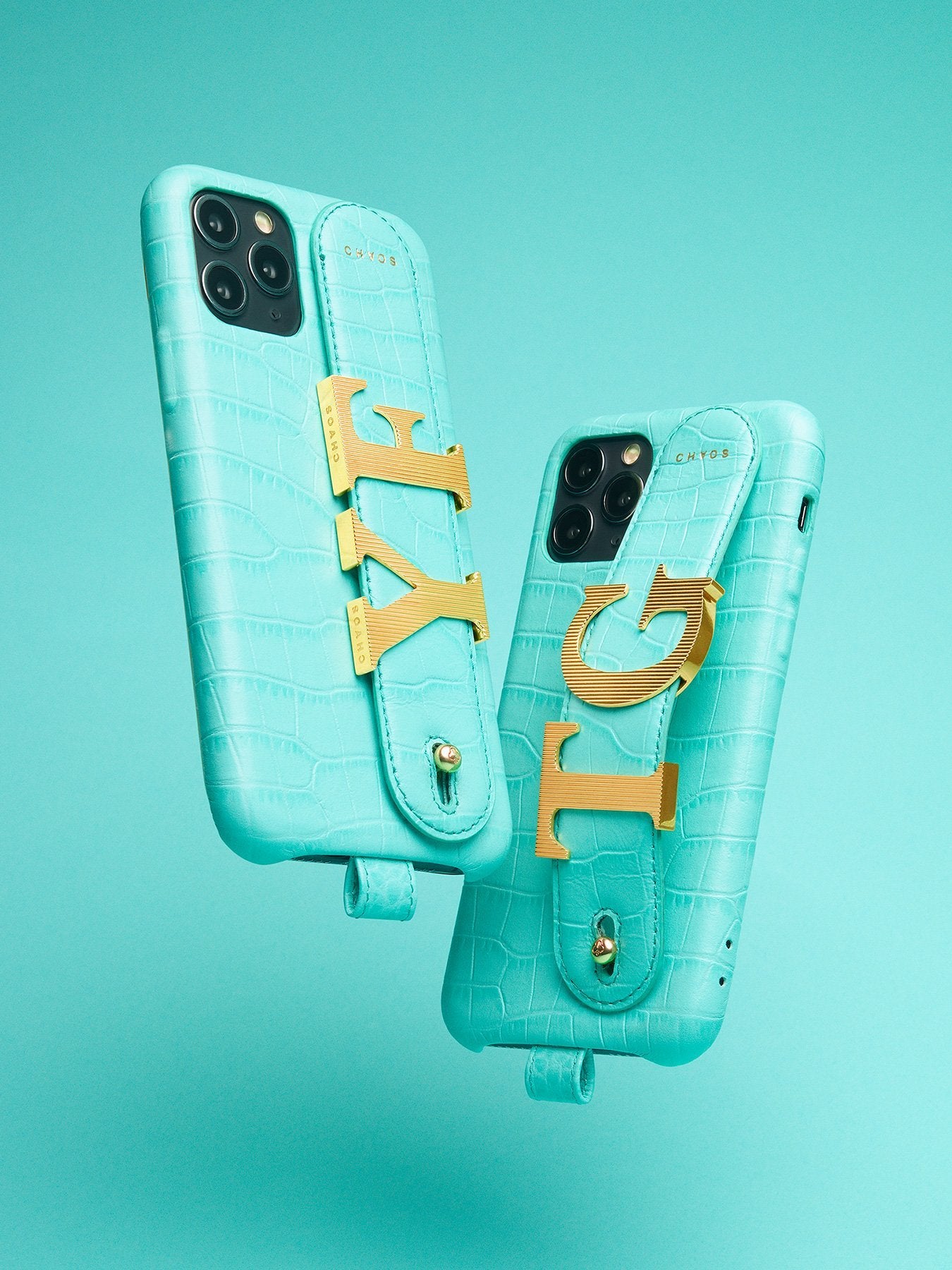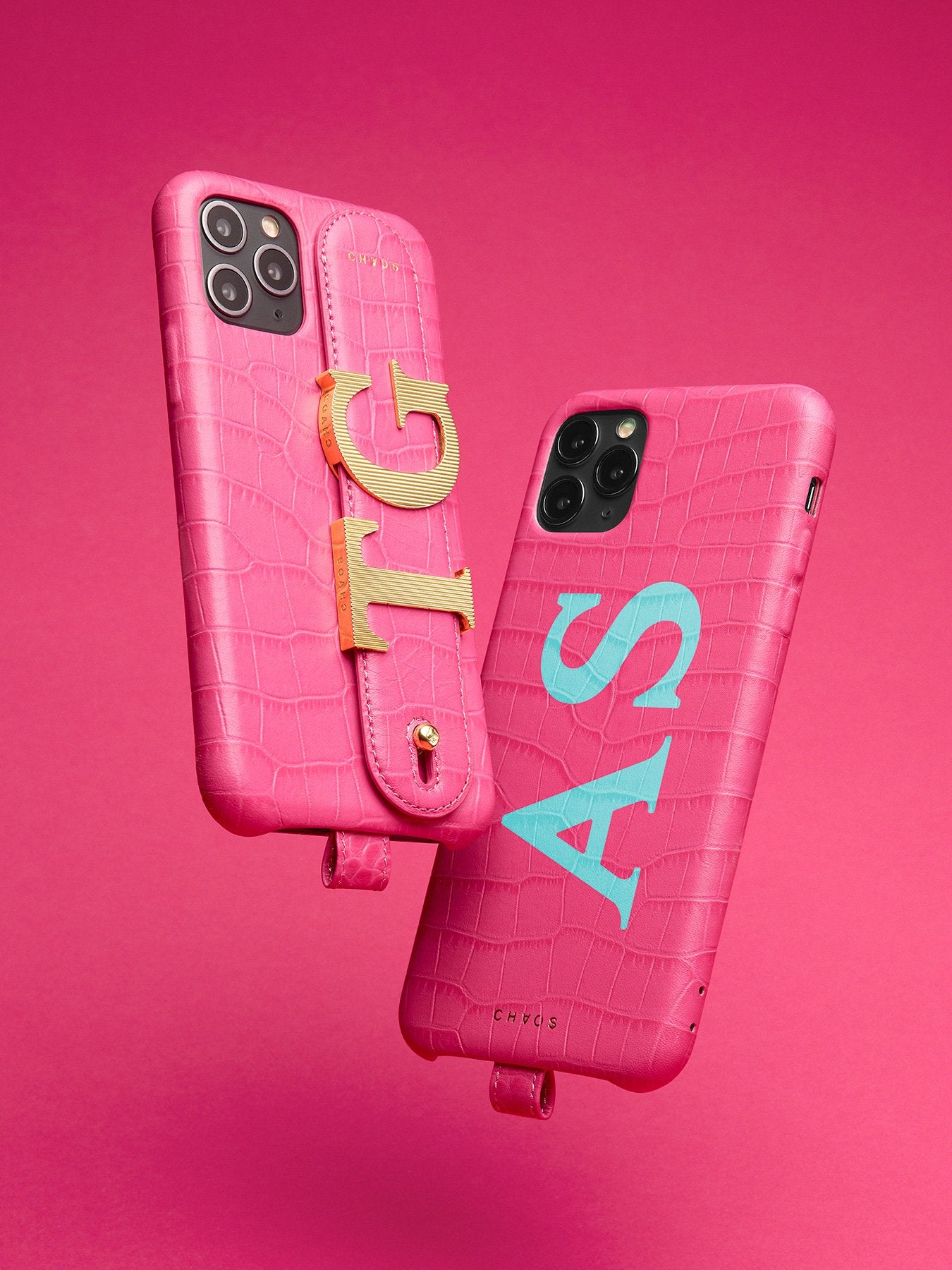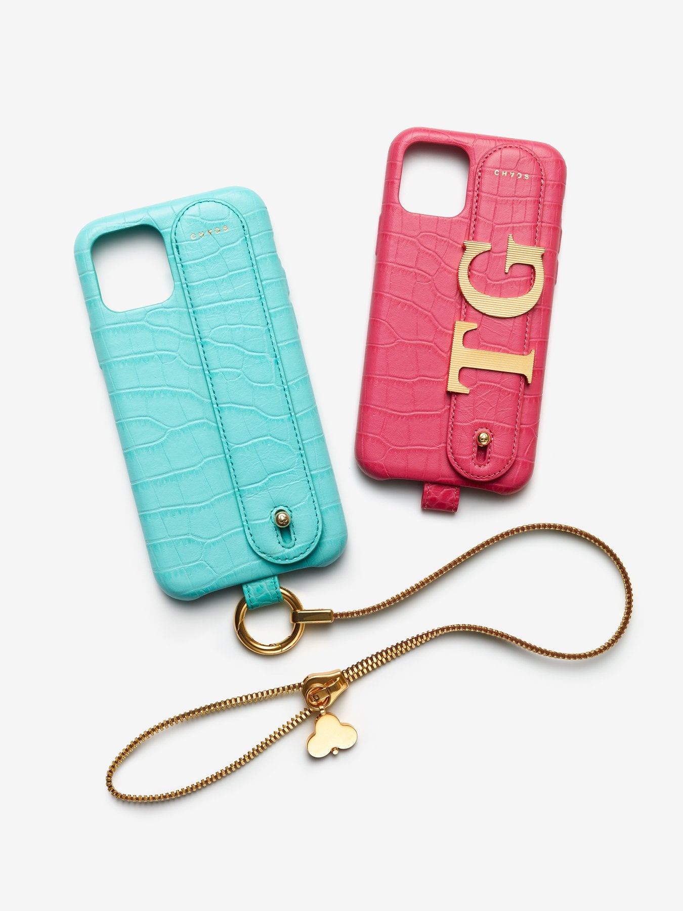 The CHAOS Charm Hand Hug, now available in delicious sherbet leather colours Raspberry and Aqua with an elegant faux alligator embossed finish.