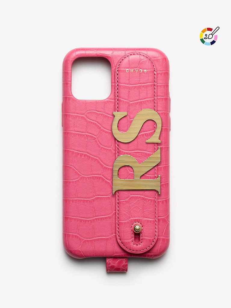 100% Calfskin leather covered iPhone case with a faux alligator embossing. Leather strap attached by gold-plated stainless steel hardware with additional gold plated slider charms.